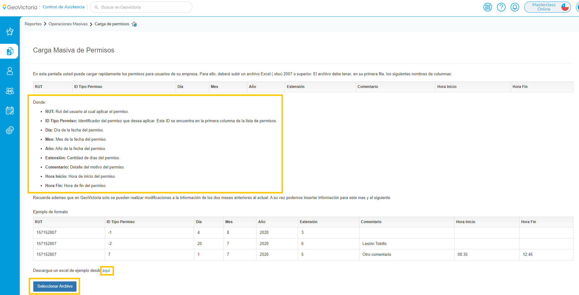 En este sección revisaremos las dos formas de cargar permisos masivos, en formato web y por planilla de excel.