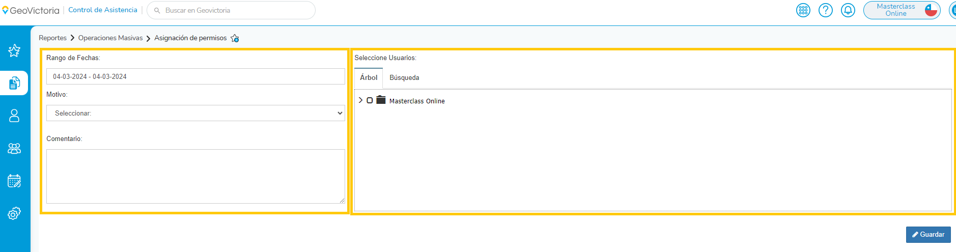 Una vez dentro de la herramienta, tendremos dos secciones, una para elegir a los usuarios o al usuario, y la otra para elegir la fecha y el tipo de permiso que se desea asignar.