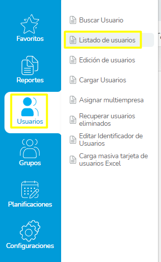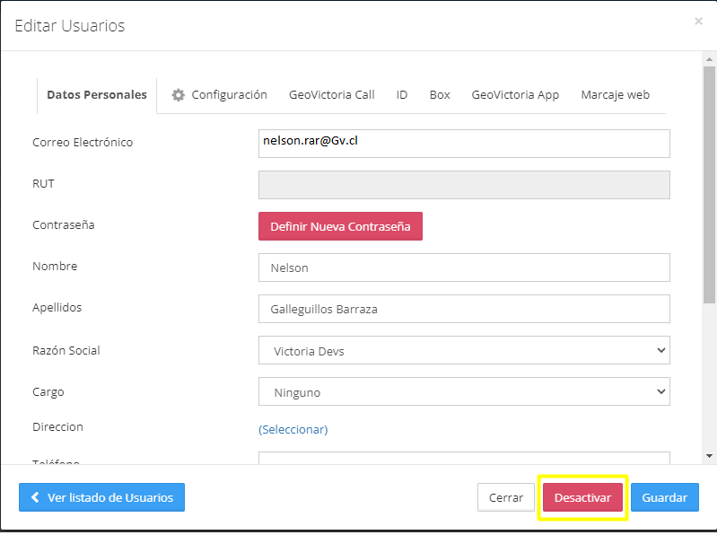 Para proceder a desactivar un usuario, solo será necesario dirigirnos a la pestaña de usuarios , luego seleccionar listado de usuarios, una vez ingresado en el listado de usuarios hay una pestaña de búsqueda que aparece en la parte superior derecha en esta opción de búsqueda deberá buscar la ficha del trabajador y una vez encontrado el usuario que se desea desactivar solo deberá seleccionar el botón de desactivar. La desactivación de usuarios no elimina la información de los usuarios sino que deshabilita al trabajador para que pueda marcar asistencia.