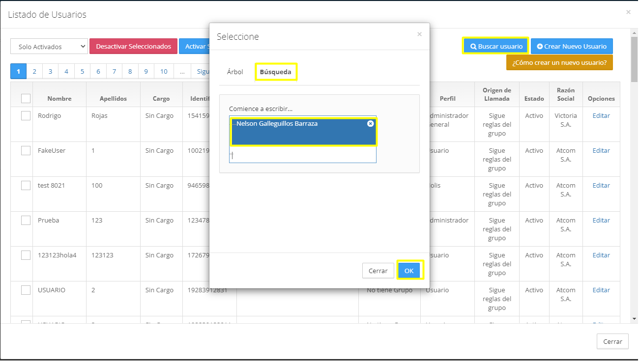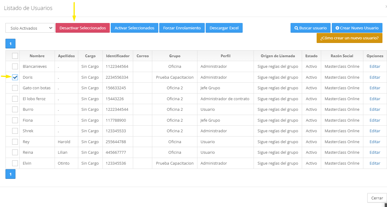 También, en la lista de usuarios, puede seleccionar al trabajador que desea desactivar, y presionar el botón rojo en la parte superior central “desactivar seleccionados”.