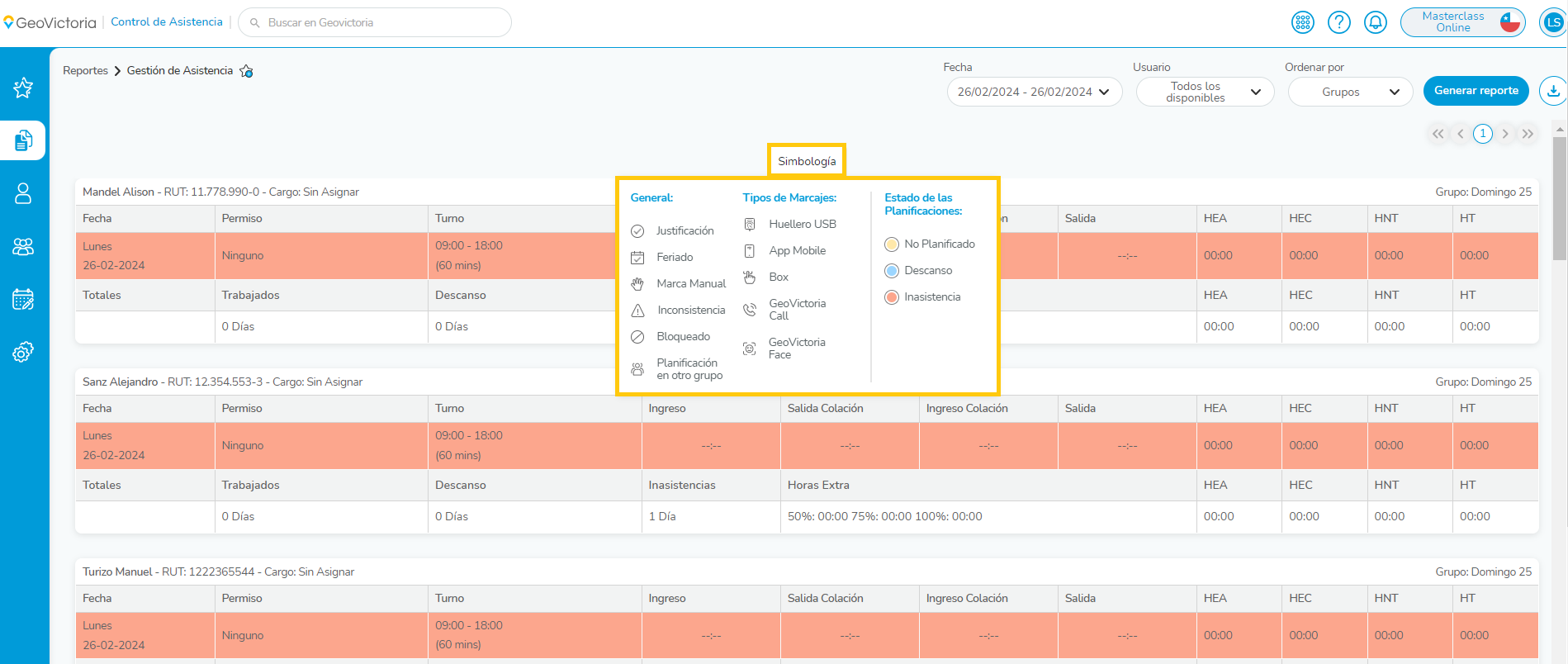 En la pestaña simbología, podemos encontrar diversos íconos que pueden aparecer en el libro de gestión de asistencia y sus significados.