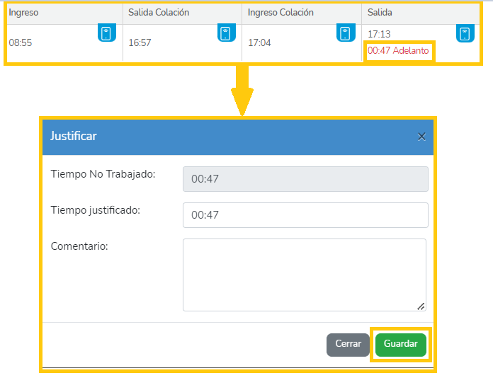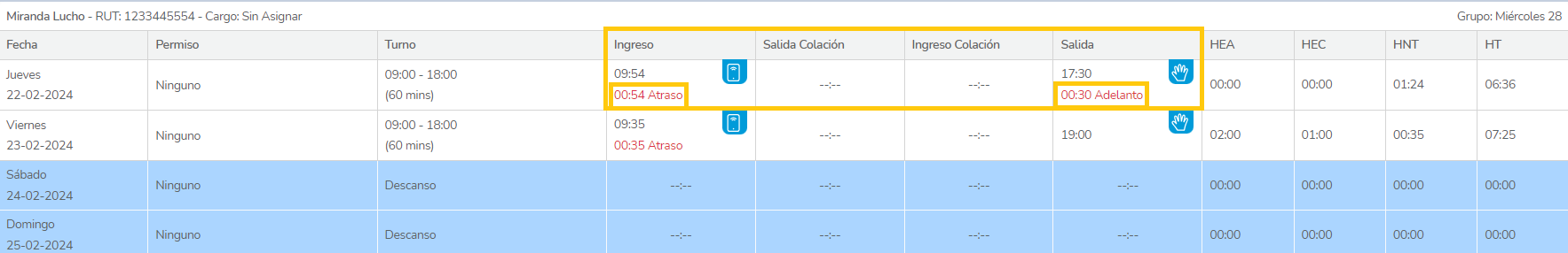 Una vez justificado, la casilla del atraso o adelanto se vera de la siguiente forma: