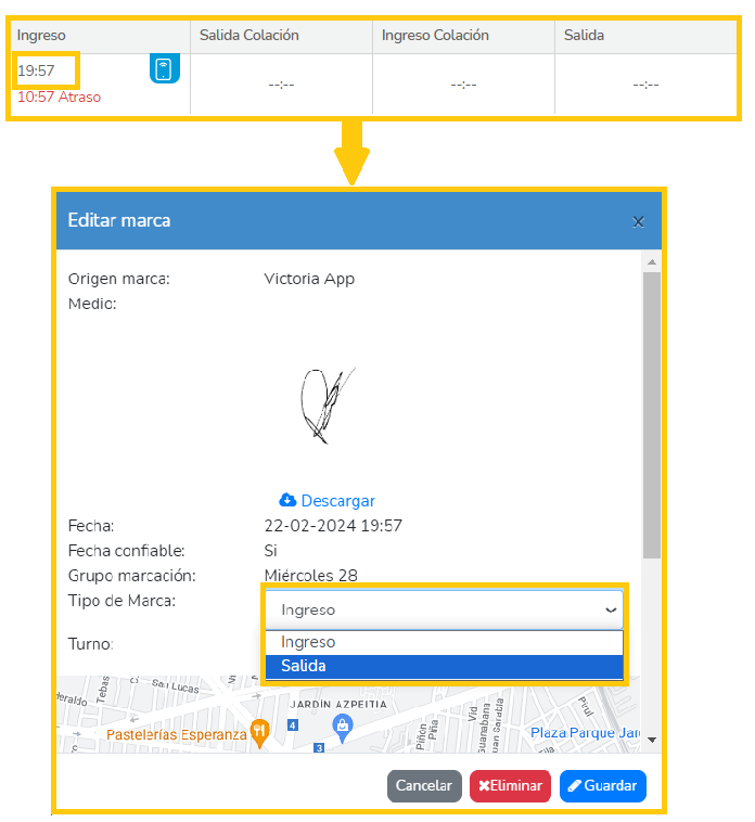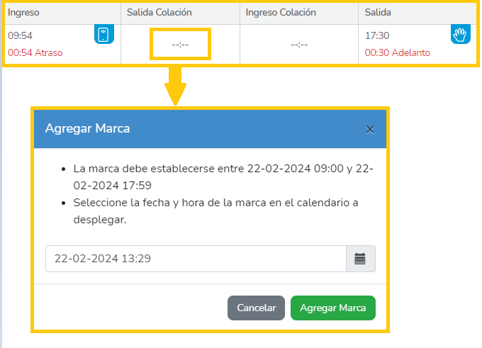 2.2 Haciendo clic en una casilla que contiene una marca de usuario, podemos modificar el tipo de marca (ingreso o salida), como también ocultar una marca real o eliminar una marca manual en caso de existir error en el registro. Al crear o eliminar una marca, el usuario recibirá un correo dando aviso de esta modificación y, en el caso de una marca manual, tendrá un tiempo de 48 horas para rechazar la marca ingresada. Si el usuario no realiza ninguna acción dentro de ese tiempo, la marca se dará por aceptada.