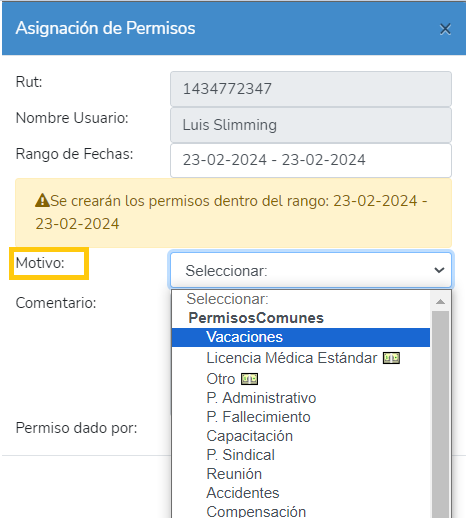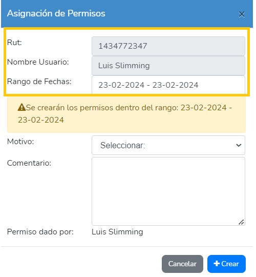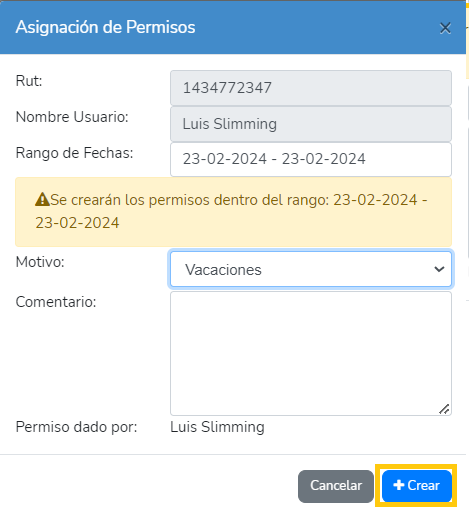 Una vez seleccionado el motivo, seleccionamos “Crear” y el permiso quedara asignado.