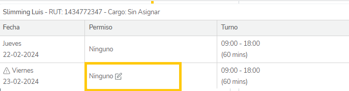 La columna Permiso nos permite asignar un permiso al usuario en el día planificado que seleccionemos, como también modificar un permiso ya existente. Haciendo clic en la casilla de permiso donde indica ninguno