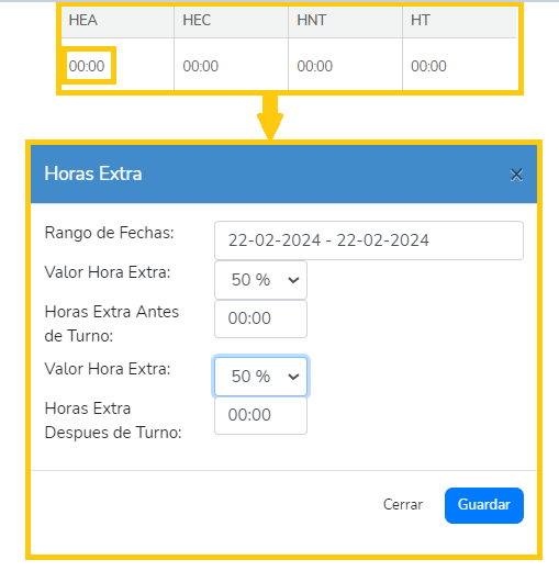 Si hacemos clic en la casilla de HEA, se desplegará una ventana donde podremos asignar horas extras a un usuario. Podremos asignar por separado horas extras para ser cumplidas antes del turno o después del turno seleccionando también el porcentaje de horas extras que se cancelará.