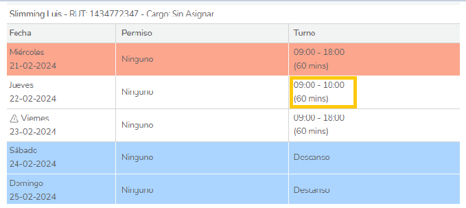 - Turno: visualización de turno planificado y asignación de turno para cada día al usuario. Revisar más acerca de turnos.