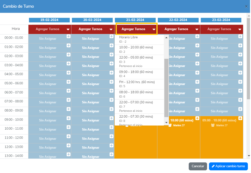 Se desplegara una nueva ventana de cambio de turno, permitiendo modificar el día seleccionado , el día anterior y posterior, para realizar dicha modificaciones debemos seleccionar “Agregar Turno” y se desplegara el listado de turnos . Esto puede ser útil para para cambios puntuales.
