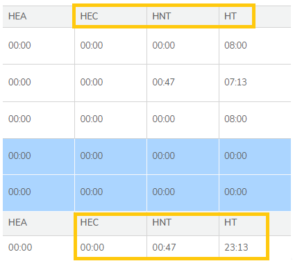 - Totales: Nos muestra la suma de HEC (horas extras cumplidas), HNT (horas no trabajadas) y HT (horas trabajadas) del periodo de tiempo mostrado en el reporte.