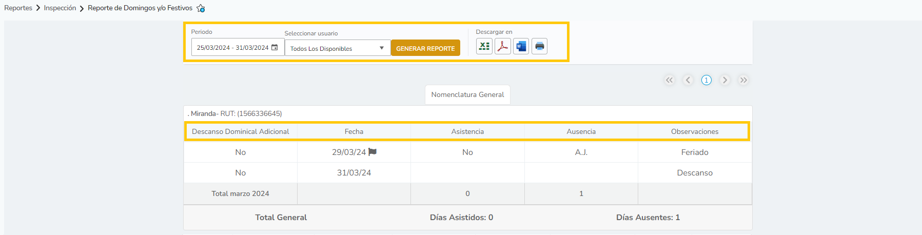 En este reporte indica qué trabajadores presentan asistencia o inasistencia para los días Festivos y Domingos.