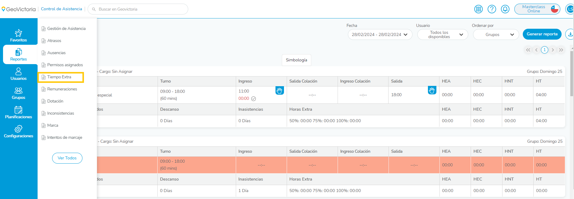 Para acceder a este reporte tendremos que dirigirnos a la  pestaña  “Reportes” y seleccionar la opción de reporte de Tiempo Extra.