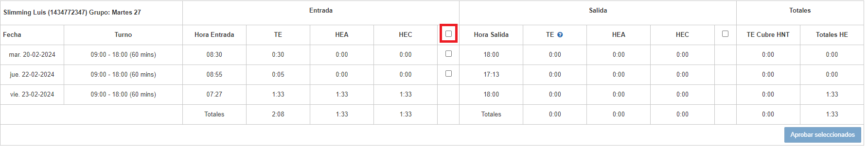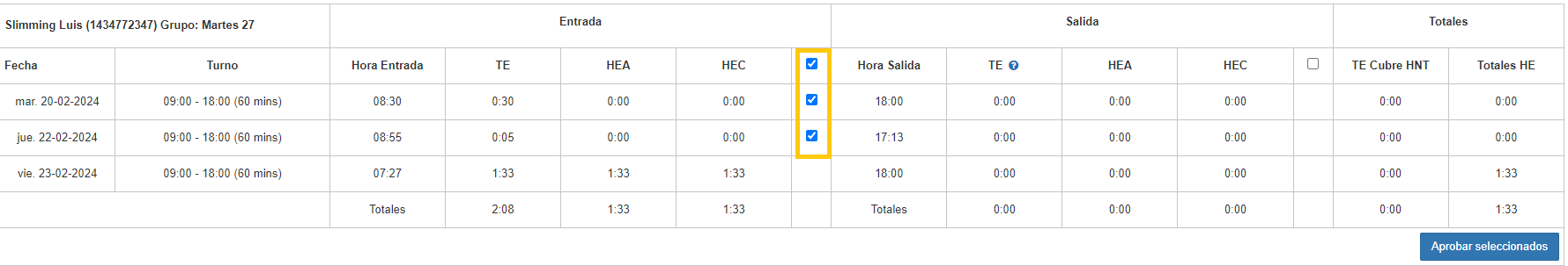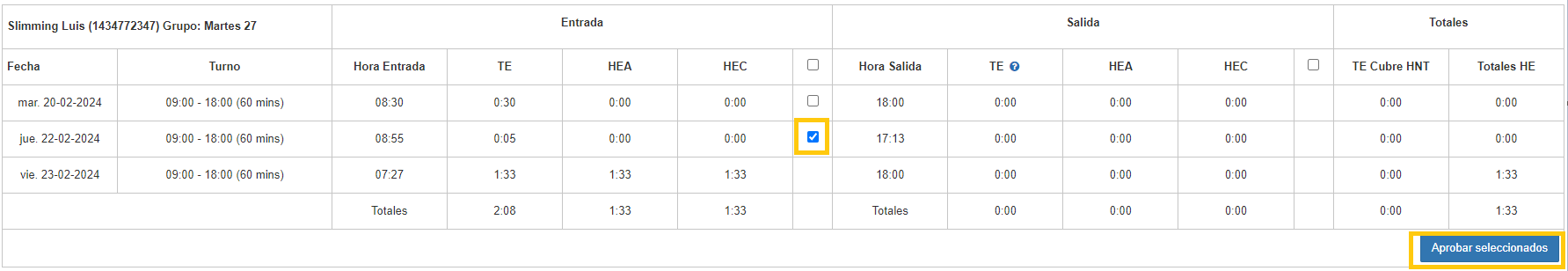 En el reporte, aparte de visualizar la información, nos permitirá poder aprobar las horas extras para un día en especifico . Para lograr aprobar una hora extra específica, debemos seleccionar la casilla de la hora que deseamos autorizar y posteriormente guardamos la información en el botón inferior derecho “Aprobar seleccionados”.