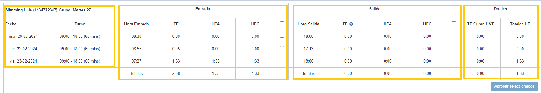 Acá podremos ver a los trabajadores que han realizado tiempo extra (TE), antes de iniciar su turno o después de finalizar su turno.