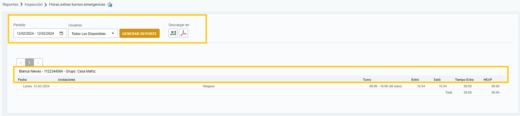 Este reporte mostrará información acerca de los turnos de emergencia generados por el trabajador, en caso de que la empresa tuviese activa la opción de turnos de emergencia. En caso contrario, no aparecerá este reporte a la Inspección.