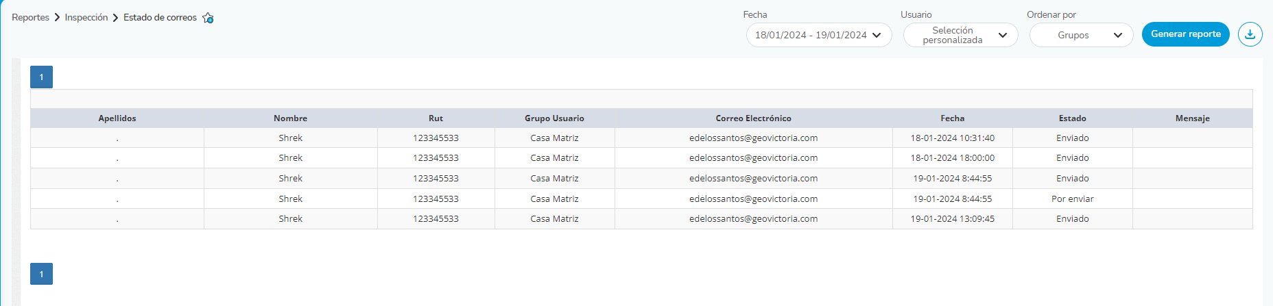 - Estado: Nos indicara si el correo fue enviado. Pueden aparecer varios estados a considerar, entre ellos; Spam (el trabajador no recibe nuestros correos en la bandeja principal), Por enviar (Cuando está por enviarse desde nuestra base de datos, y seguidamente cuando se envía aparece otro registro en “enviado”), Rebot (Puede haber problemas con el correo del trabajador), Enviado (estado normal de la notificación)
