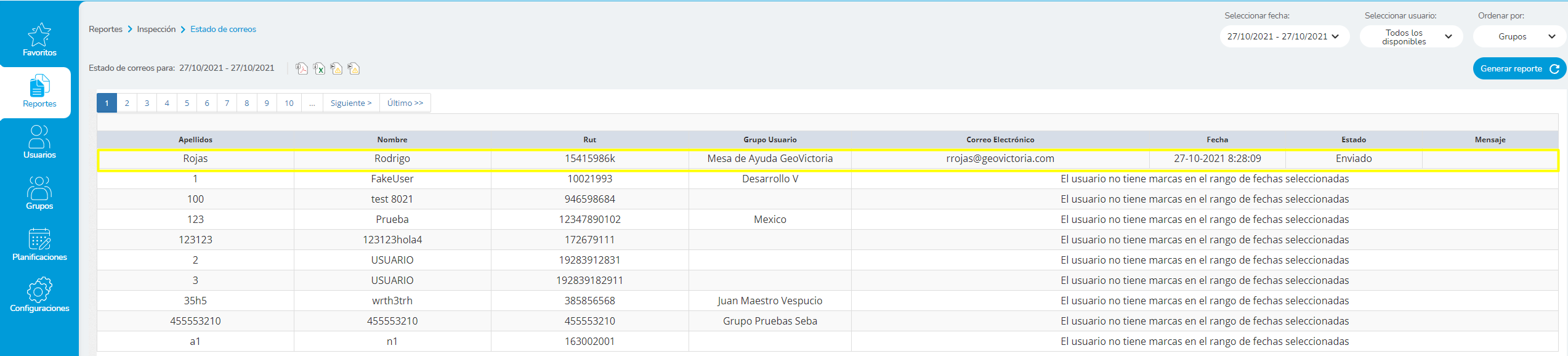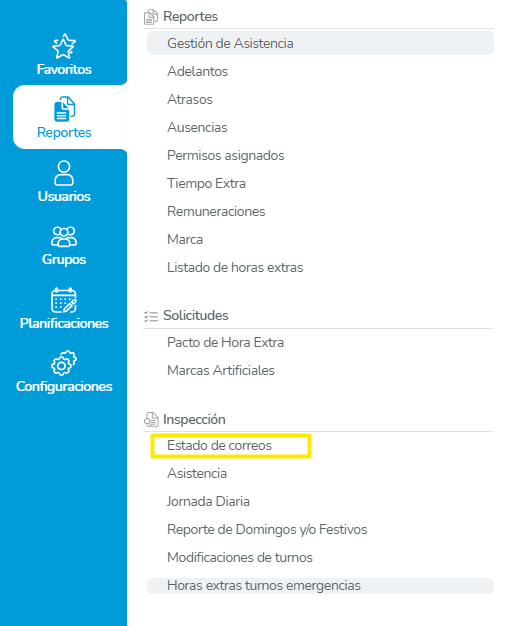 Para visualizar el reporte “Estado de correos”, debemos ingresar a la sección reportes, luego en ver todos, sección Inspección y seleccionar Estados de correos. Una vez dentro del reporte podremos ver si fueron enviados los correos a las cuentas personales de los trabajadores, en la última columna “Estado” podemos verificar si este se envió o no. En caso de no haber sido enviado, en la siguiente columna “Mensaje” se indicará la razón de la falla. Hay varios mensajes que pueden aparecer: