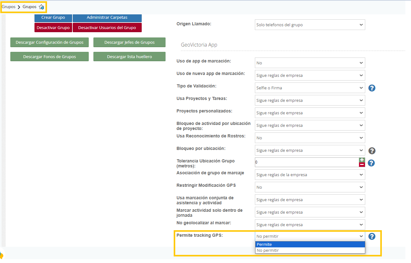- Sobre la opción de Permitir seguimiento por GPS aparecerán 2 opciones “Permite” y “No permitir”, debe seleccionar la opción “Permite si requiere que se habilite el trackeo GPS para el grupo el cual esta configurando