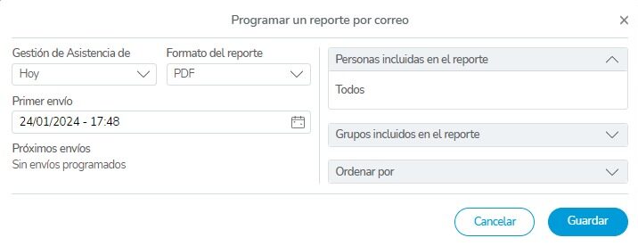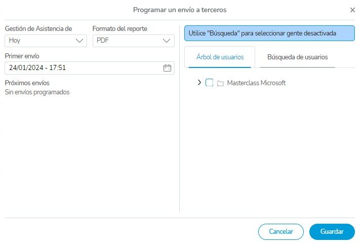 - Para programar el envío es simple. Seleccione el reporte que desea enviar al correo, aplique los filtros correspondientes (fecha y usuarios), genere el reporte y luego seleccione la opción de programar reporte y elija la opción más adecuada a su necesidad. Una vez programada la alerta, la misma quedará guardada.