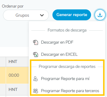 Para configurar un envío debemos irnos al lado derecho del reporte y presionar el botón de descarga que se encuentra a un costado de generar reporte, al seleccionar se nos desplegaran las opciones de descargar reportes y la programación de estos, cuenta con dos alternativas: