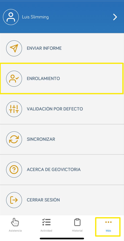 1. Pulsar sobre la pestaña Más, y después pulsar sobre la opción Enrolamiento.