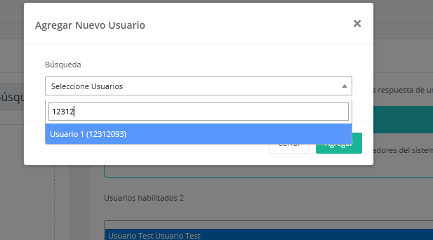 Para agregar a un usuario a la lista de personas a las cuales se les debe notificar una respuesta, debe dar clic en el botón “Agregar” en la esquina inferior derecha del cuadro. Al dar clic, se mostrará un nuevo cuadro dialogo, en donde deberá ingresar el nombre de usuario o identificador del mismo para poder agregarlo a la lista, tal y como muestra la siguiente imagen: