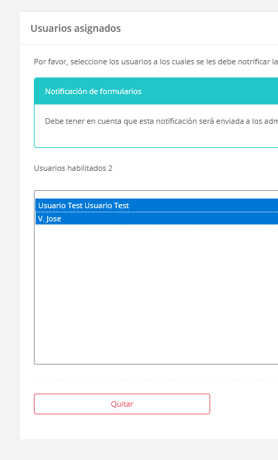 Cabe destacar que la selección puede ser múltiple, por lo que puede seleccionar la cantidad de usuarios que estime conveniente. Luego de seleccionar al usuario en cuestión debe dar clic en el botón “Quitar” lo cual desplegará una ventana de confirmación: