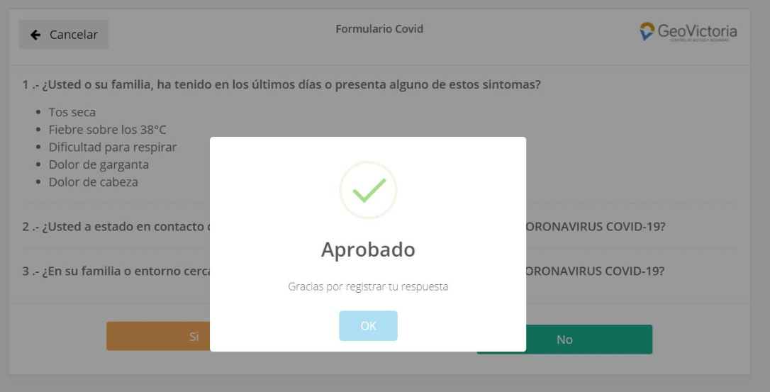 Su respuesta será registrada como denegada, pues presenta un nivel de riesgo, por lo que se le solicitará dirigirse al área designada o ponerse en contacto con algún administrador del recinto al cual asistirá.
