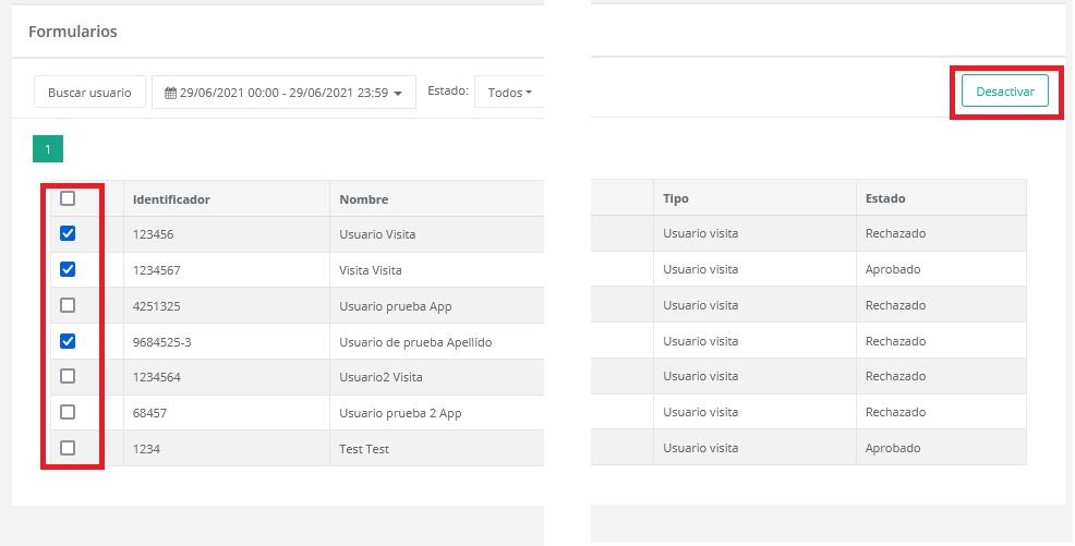 Para que un usuario pueda volver a responder el formulario de un día determinado, este se debe desactivar, para esto debemos seleccionar los formularios a desactivar y presionar en el botón “Desactivar” como muestra la siguiente imagen: