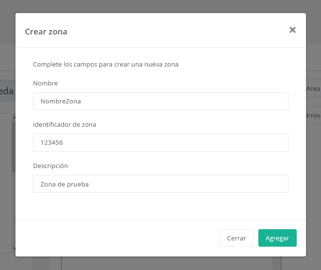 Se abrirá un diálogo con campos para completar la información de la zona a crear, y el botón “Agregar”, el cual debemos presionar luego de completar los campos para que agregar la nueva zona.