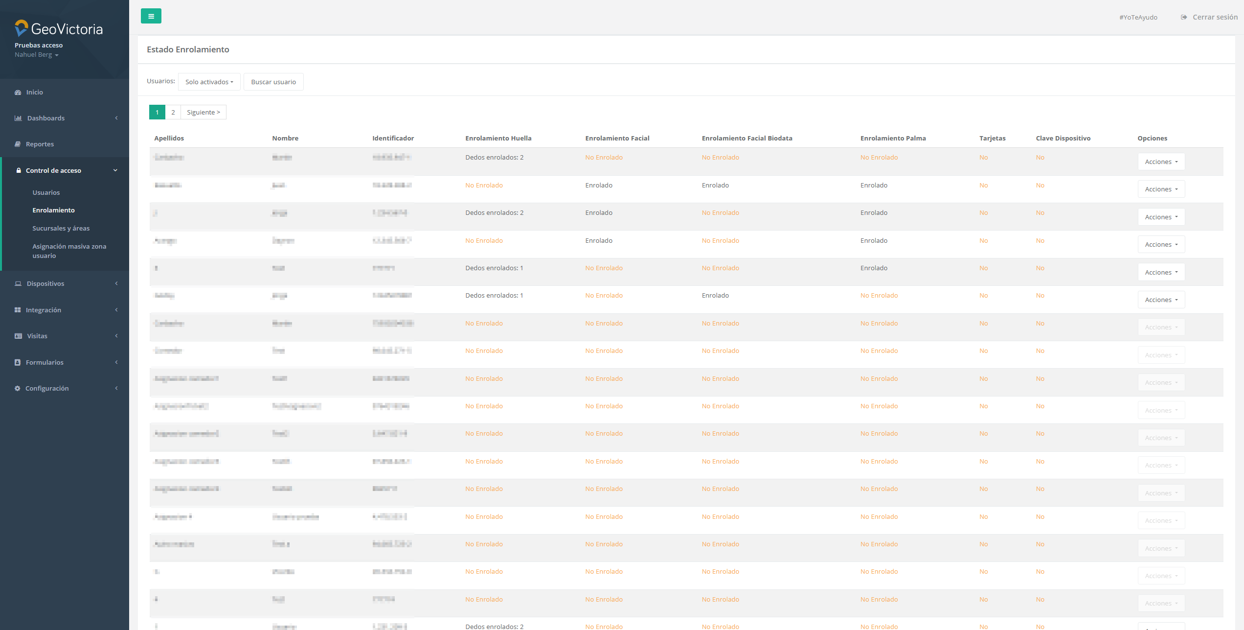 En esta sección encontraremos una lista con los usuarios, junto a los enrolamientos registrados en el sistema. Aquí podrá realizar las siguientes acciones: