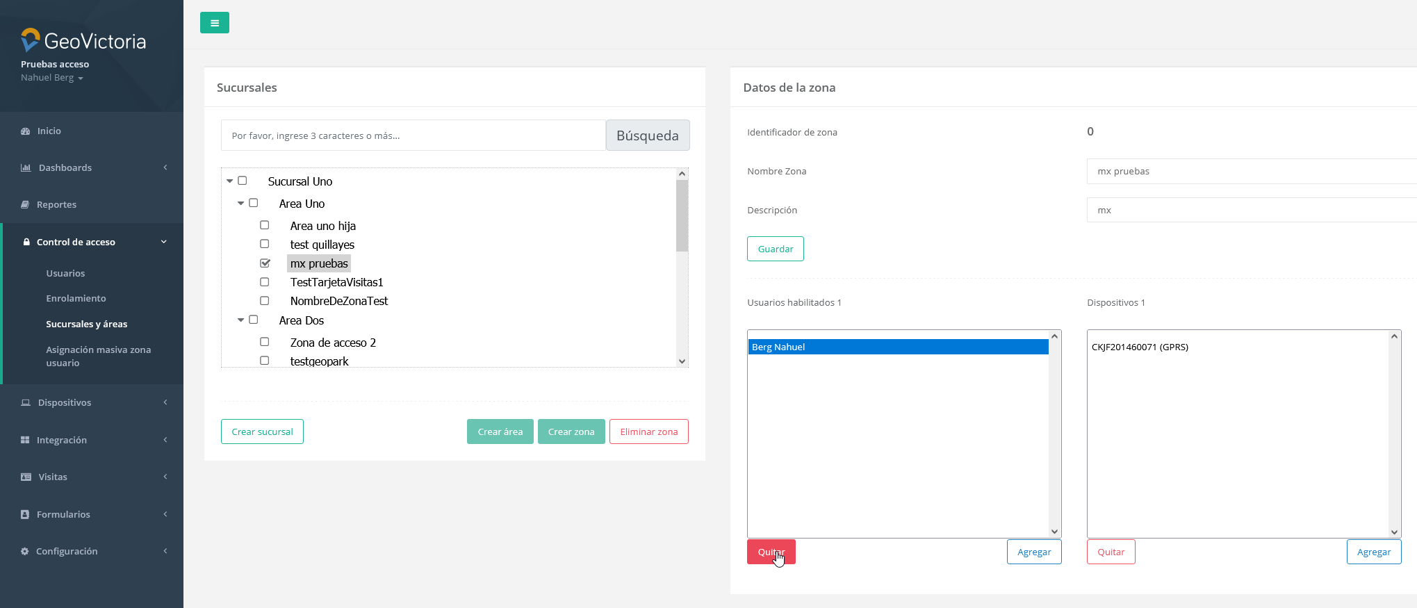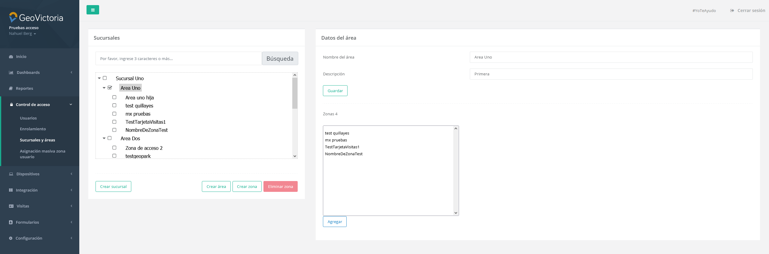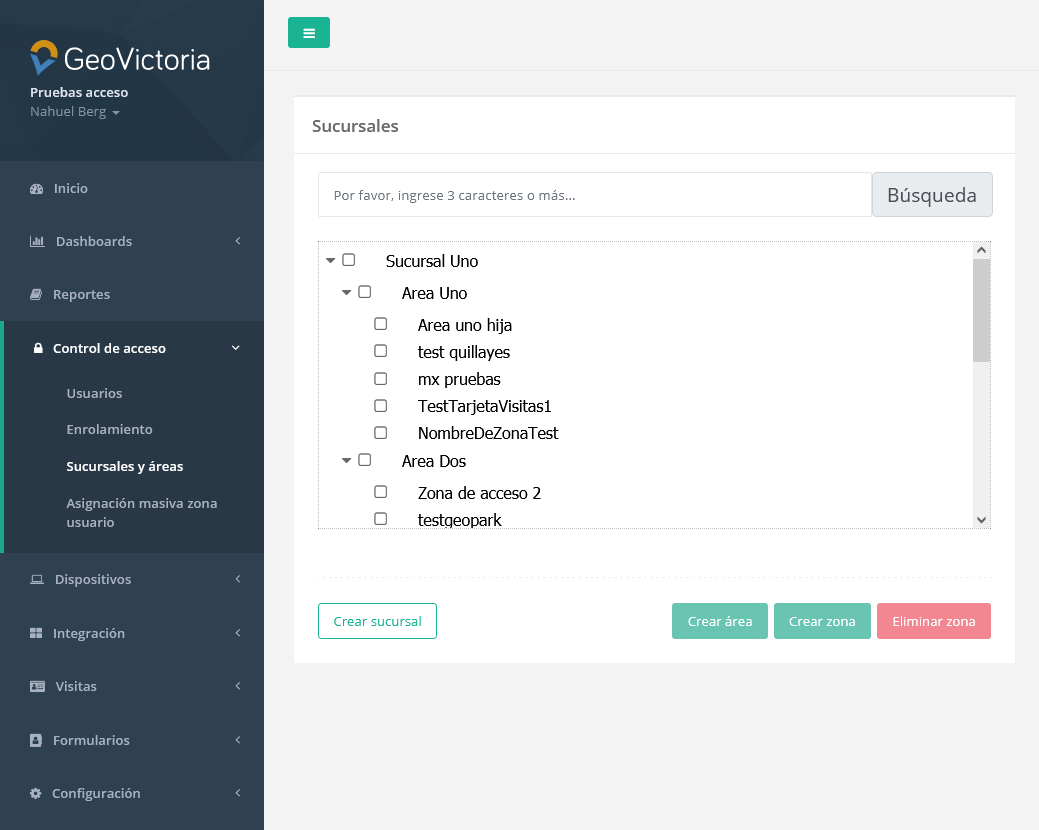 En esta sección encontraremos todas las sucursales y áreas creadas en la empresa, junto a las zonas que pertenecen a ellas. Además, podemos gestionar las sucursales y áreas, pudiendo crearlas o eliminarlas, y agregar o quitar usuarios y dispositivos a las zonas también.