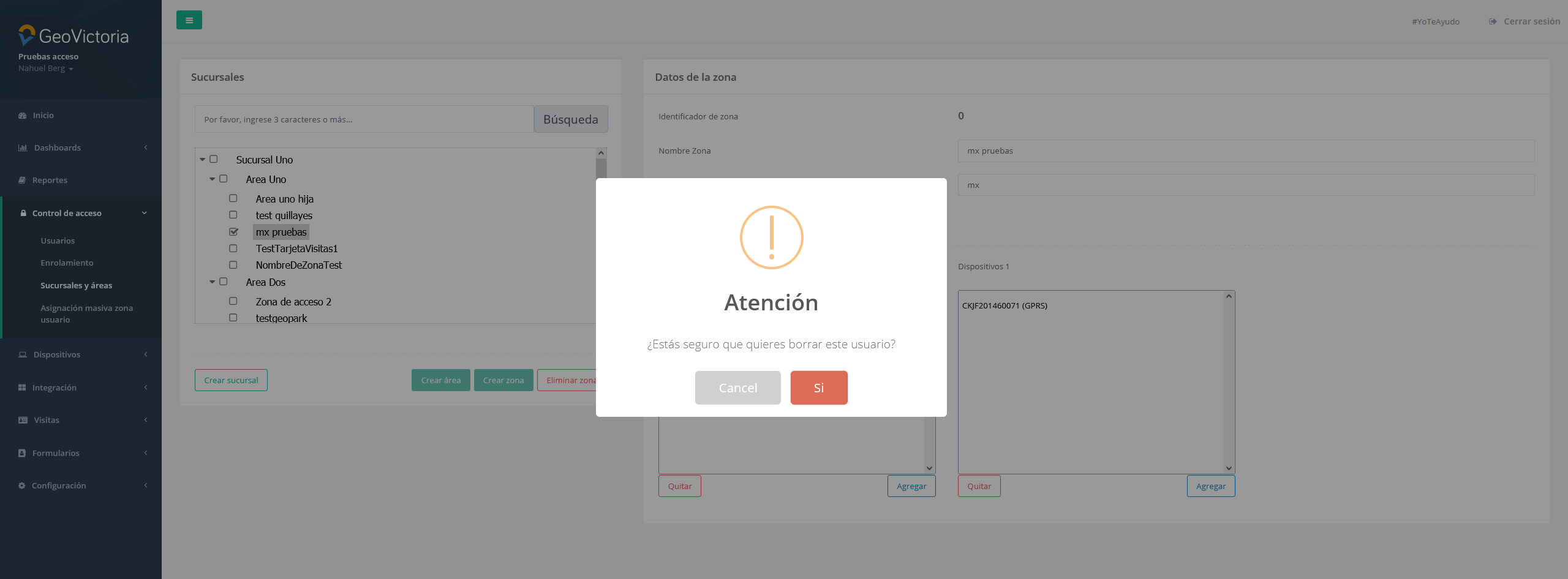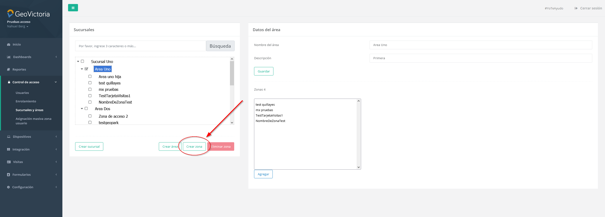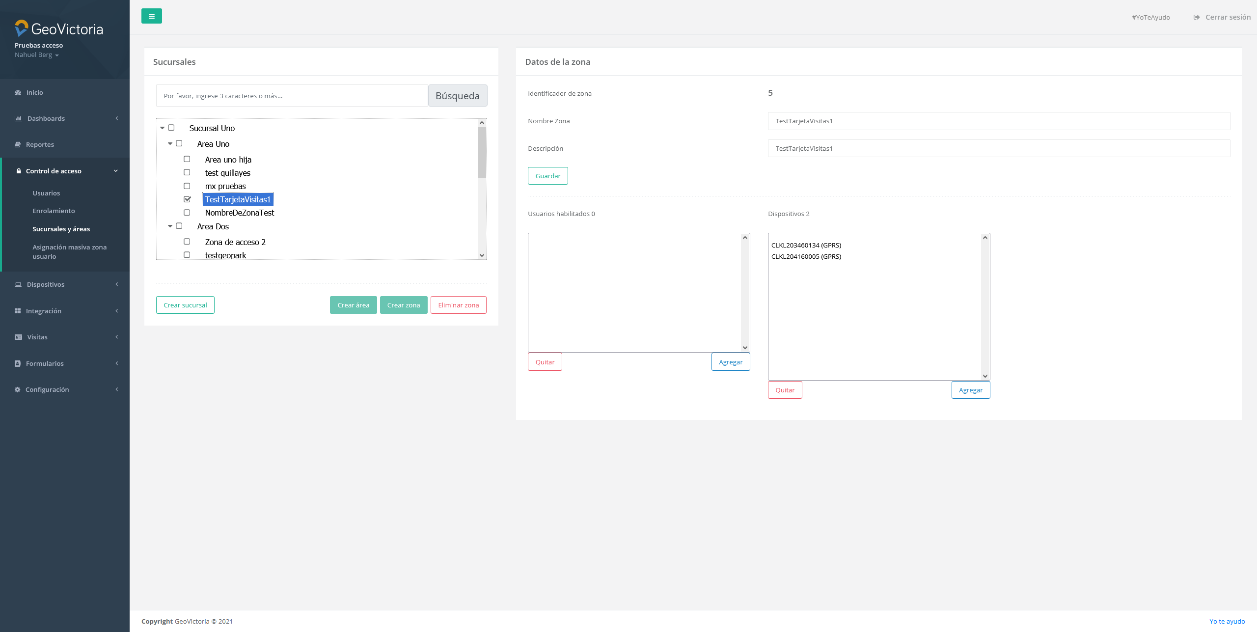 En esta sección encontraremos todas las sucursales y áreas creadas en la empresa, junto a las zonas que pertenecen a ellas. Además, podemos gestionar las sucursales y áreas, pudiendo crearlas o eliminarlas, y agregar o quitar usuarios y dispositivos a las zonas también.