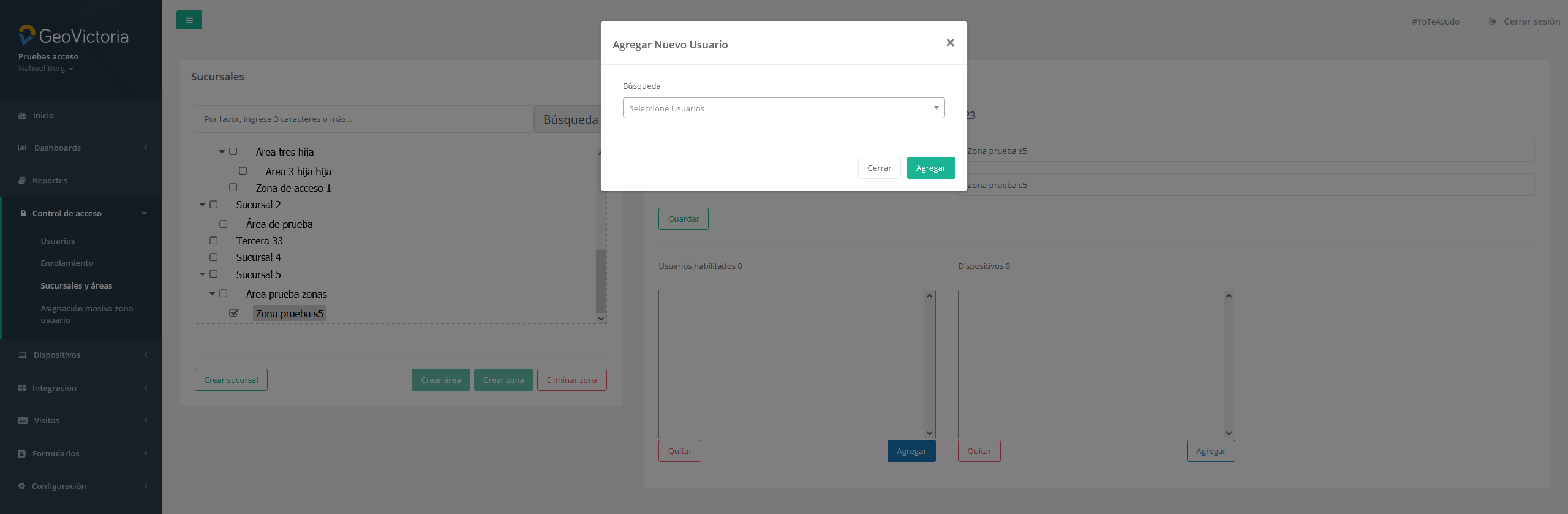 Al seleccionar una zona de acceso, podemos además observar el despliegue de sus datos como el número de zona, el nombre de ésta, los usuarios habilitados y los dispositivos asociados, como se puede observar en la imagen superior.Para conceder autorización de ingreso de un usuario a una zona, simplemente debemos presionar el botón agregar que se encuentra en la parte inferior derecha del recuadro usuarios, y se abrirá la pestaña de agregar nuevo usuario que podemos apreciar en la imagen, luego buscamos el usuario que deseamos agregar y presionamos el botón agregar de esta pestaña.