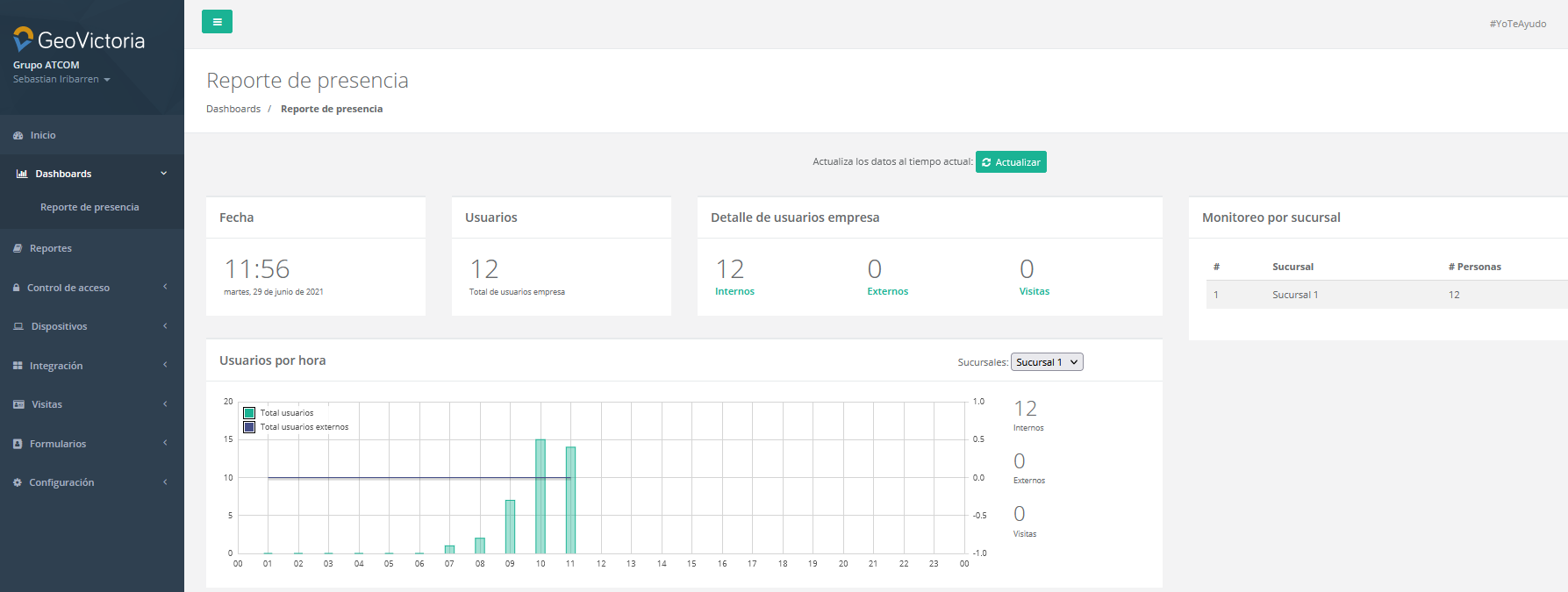 En esta pestaña podremos ver el total de usuario que se encuentran en la empresa detallados por internos, externo y visitas, y monitoreados por sucursal, como muestra la imagen.
