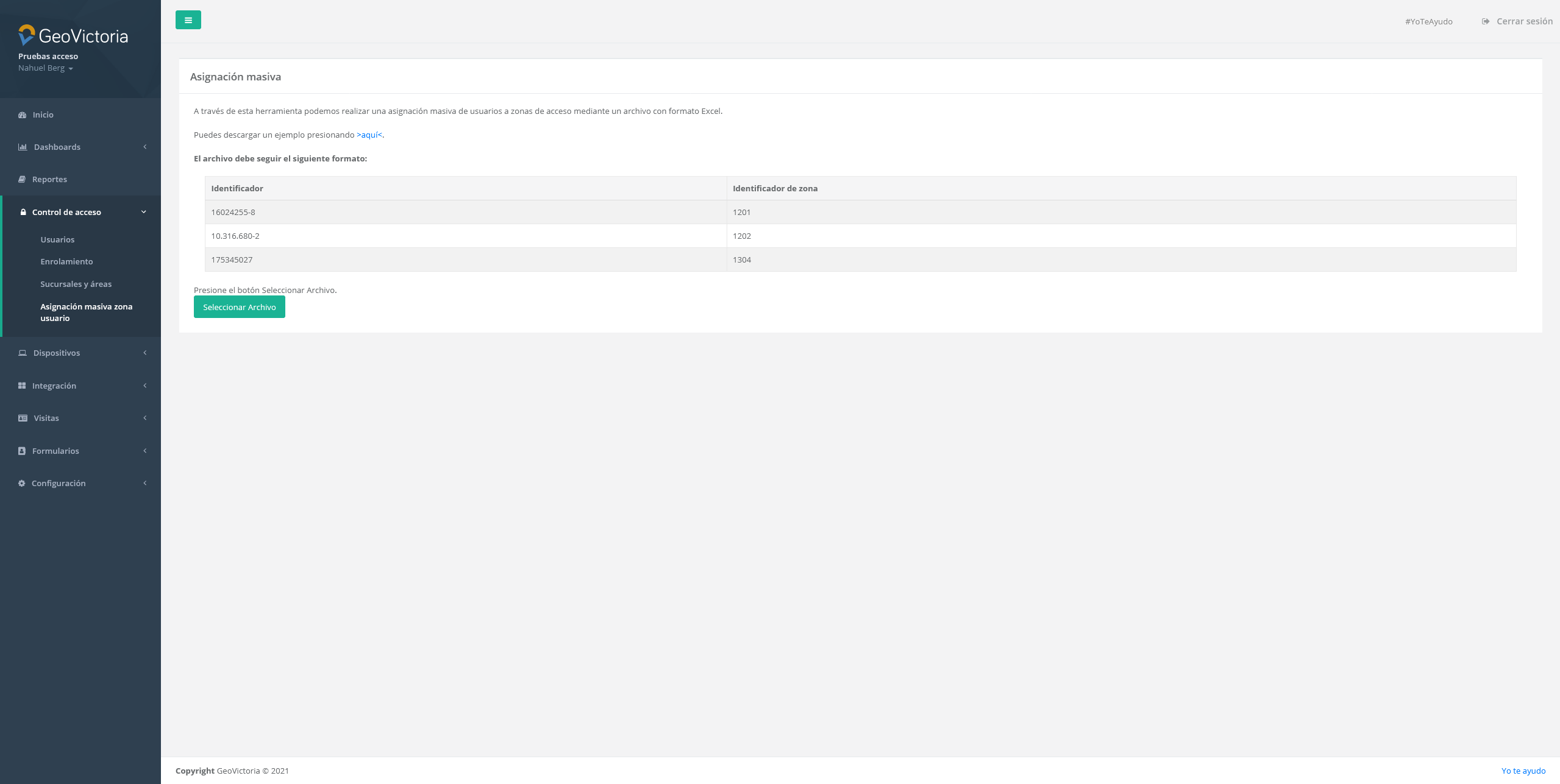 En esta pestaña podremos asignar de forma masiva usuarios a zonas especificas mediante un archivo con formato Excel.