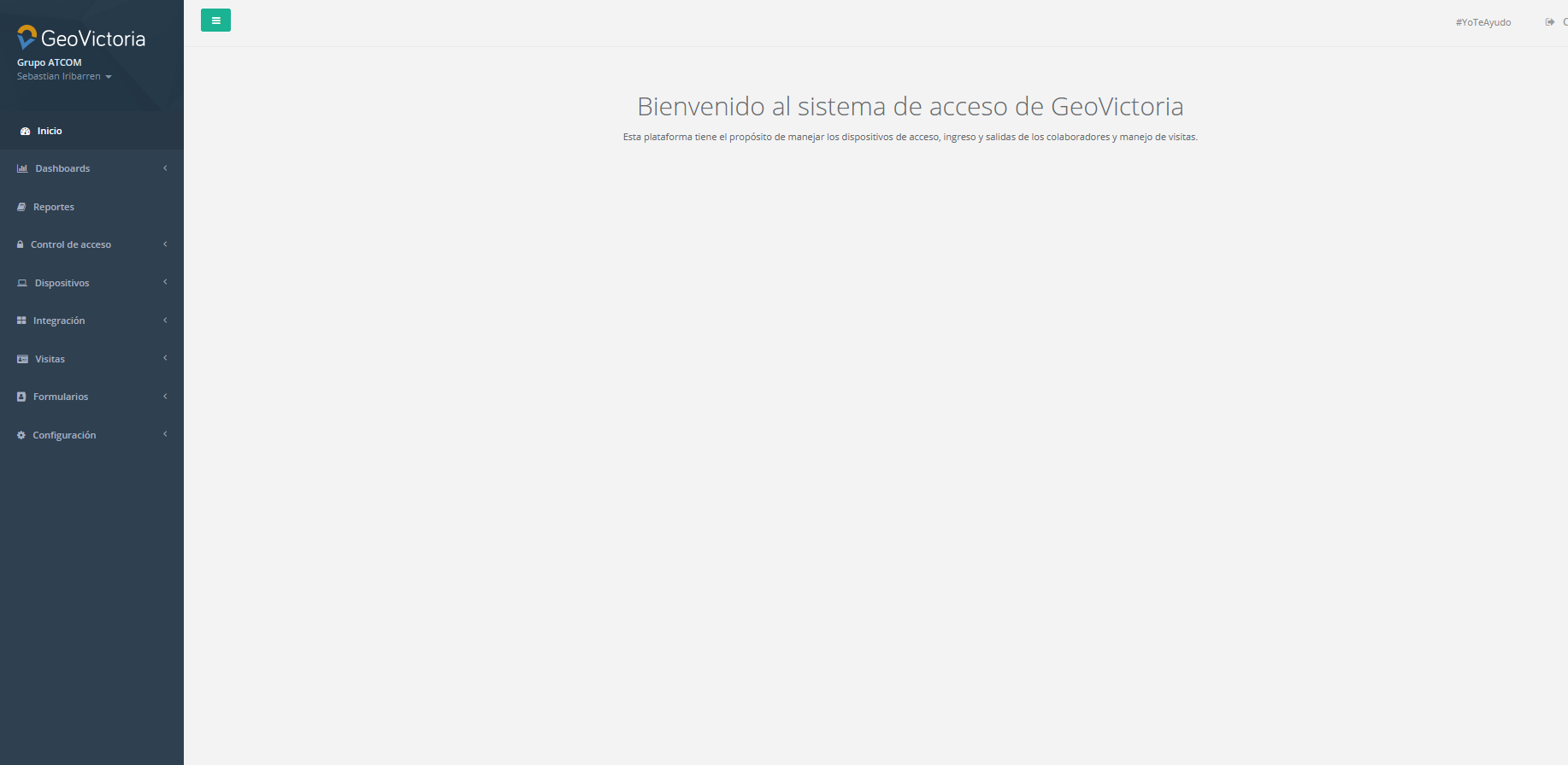 Para ingresar a la plataforma, ingresamos a la página de GeoVictoria, y buscamos el botón de Acceso Usuarios. Una vez ahí ingresamos con nuestras credenciales. Al momento de ingresar, nos encontraremos en la plataforma de GeoVictoria asistencia, y para ingresar en la plataforma de acceso, presionamos en el nombre de nuestra empresa y se nos desplegará un panel, en el cual tenemos la opción de Portal Acceso, como podemos apreciar en la imagen. Hacemos clic en Control de acceso beta. Al ingresar a la plataforma de acceso, quedaremos en la sección de inicio, en donde se muestra una pequeña descripción de la plataforma.
