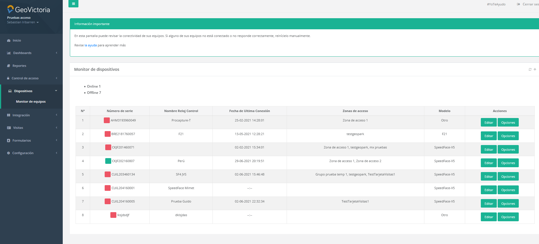 En la pestaña dispositivos, nos encontramos con el monitor de equipos, en el cual podremos observar si nuestros dispositivos se encuentran o no en línea, pudiendo revisar en el cuadro el N° de serie, nombre del dispositivo, fecha y hora de su última conexión, a que zona o zonas de acceso pertenece, el modelo del dispositivo y las acciones que podemos realizar.
