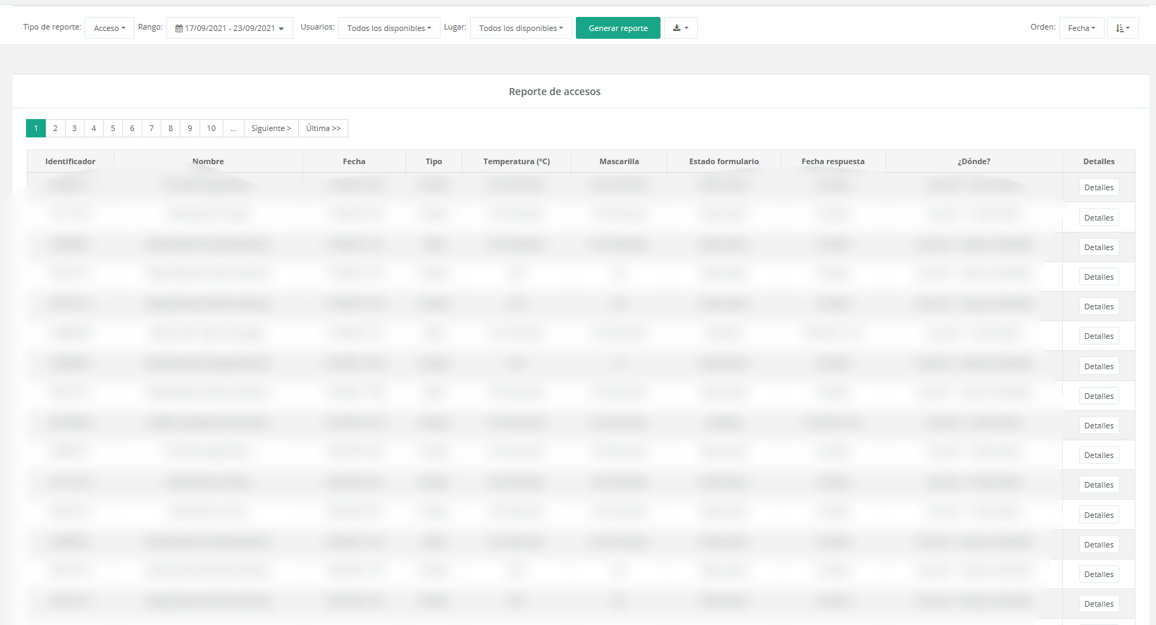 • Reporte Acceso, en donde visualizaremos las aperturas de las puertas, si las marcas tienen un formulario asociado se mostraran las columnas “Estado de formulario” y “Fecha respuesta”, y en el caso de que las marcas sean realizadas en un dispositivo que permita el control de  “Temperatura” y “Mascarilla” de igual manera las columnas serán agregadas en el reporte.