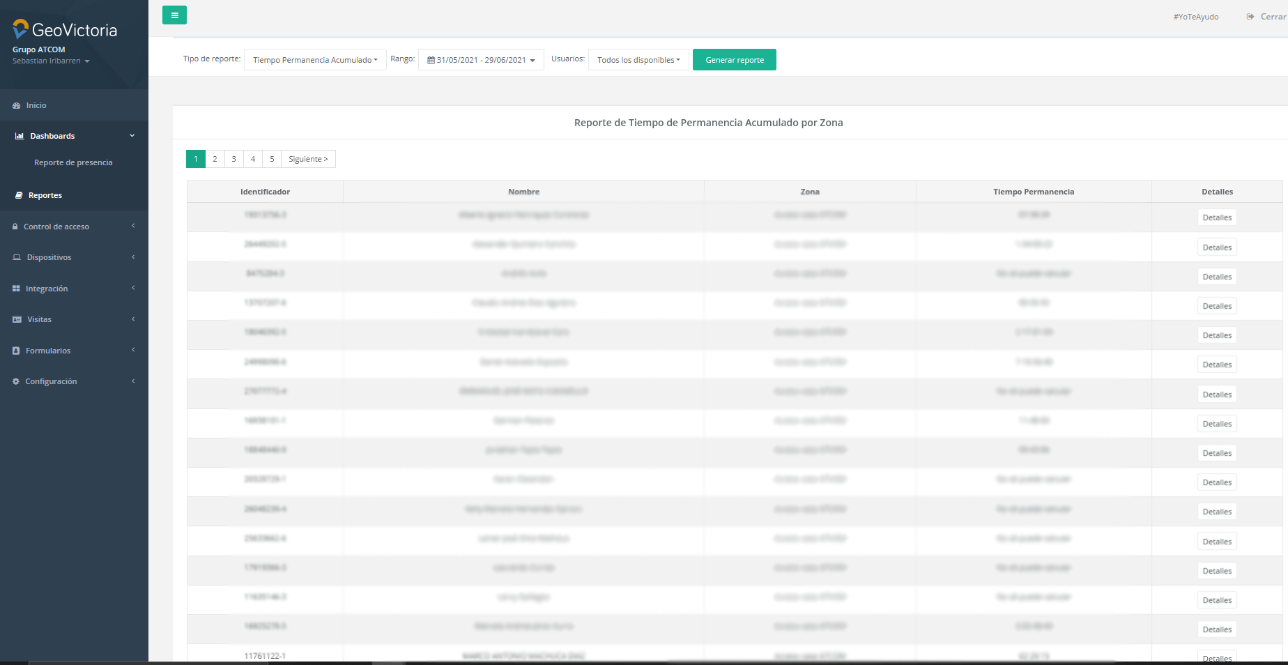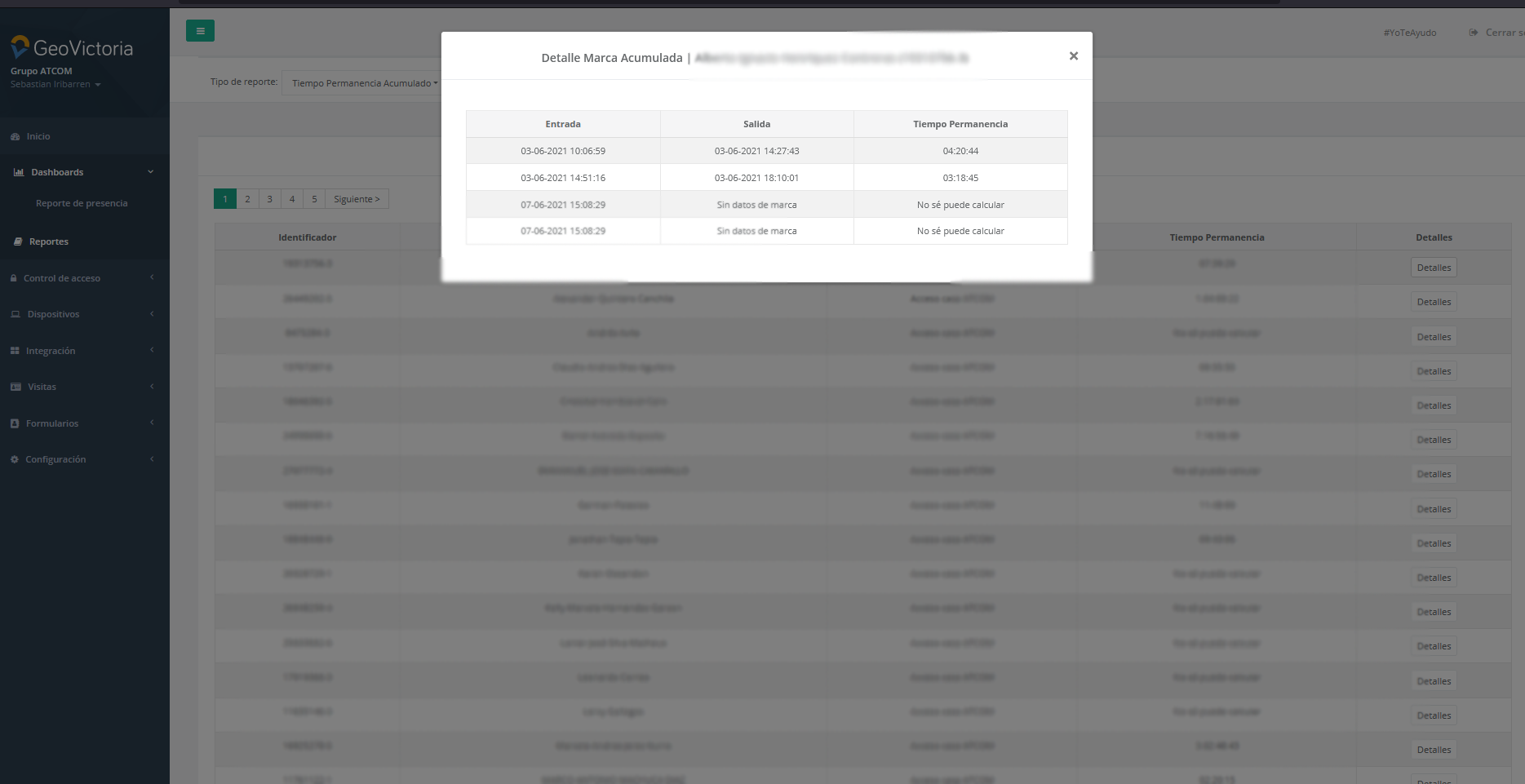 • Reporte Permanencia Acumulado, en donde visualizaremos el total de tiempo de permanencia por cada usuario en cada zona ingresada, ademas de contar con un detalle de todas aperturas y los tiempos de permanencia en la zona con los que son calculados el total de tiempo de permanencia . El reporte puede ser filtrado por fecha y usuarios, como muestra la imagen.
