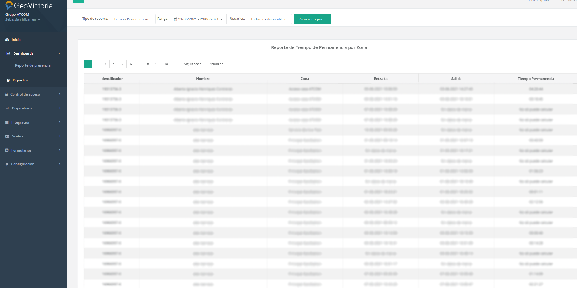 • Reporte Permanencia, en donde visualizaremos el tiempo de permanencia de cada usuario en cada uno de sus ingreso a cada zona de la empresa, especificando el ingreso y la salida. El reporte puede ser filtrado por fecha y usuarios, como muestra la imagen.