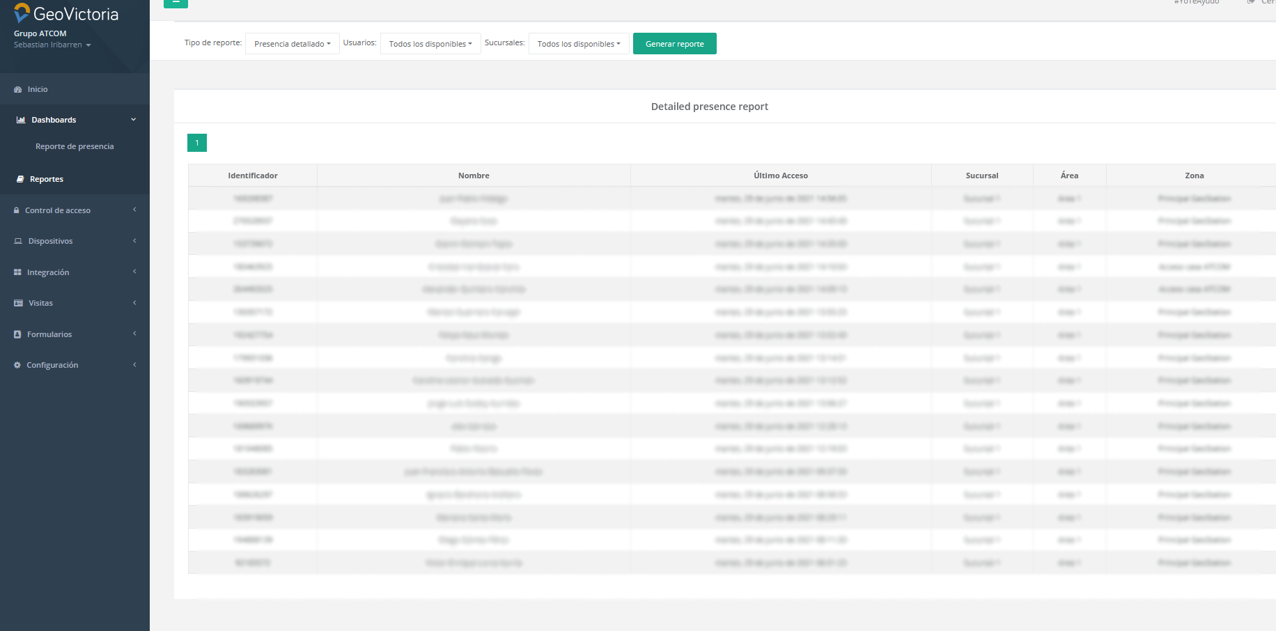 • Reporte Presencia Detallado, en donde visualizaremos la ubicación actual de los usuarios, su hora de ingreso y  la zona en la que se encuentra. El reporte puede ser filtrado por usuarios y por ubicación, ya sea sucursal área y/o zona, como muestra la imagen.