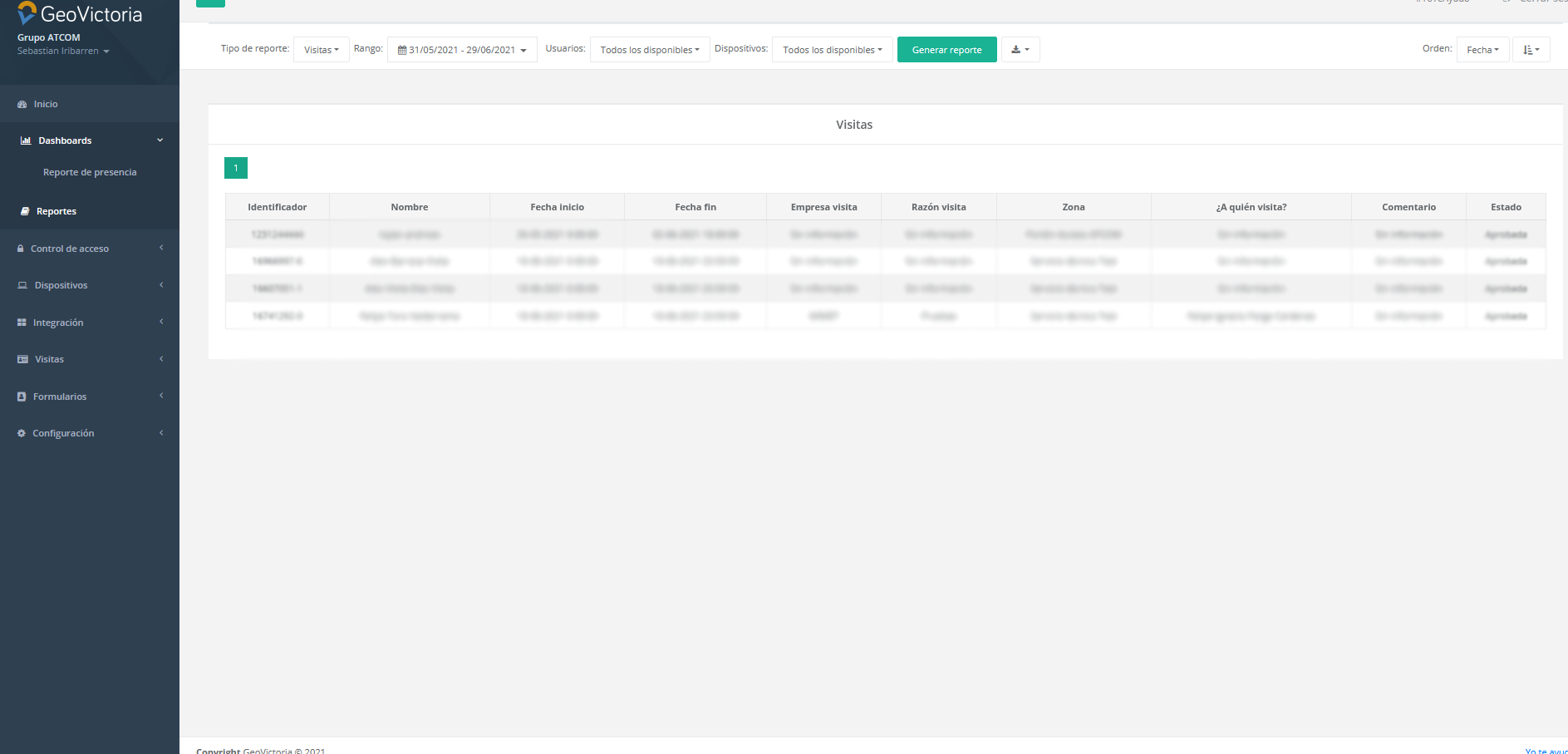 El reporte puede ser filtrado por usuarios y por lugar de acceso, ademas, el reporte puede ser exportado a un archivo MS  Excel.Reporte Visita, en donde visualizaremos las visitas agendadas, el motivo, adonde y a quien visita. El reporte puede ser filtrado por fecha, usuarios, y dispositivo, pudiendo exportar el reporte a un archivo MS Excel, como muestra la imagen.