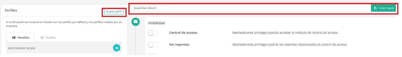 Al presionar el botón de “Nuevo perfil” aparecerá una barra donde se debe ingresar el nombre y a abajo de ella ingresar los privilegios asociados al perfil y presionamos crear perfil.