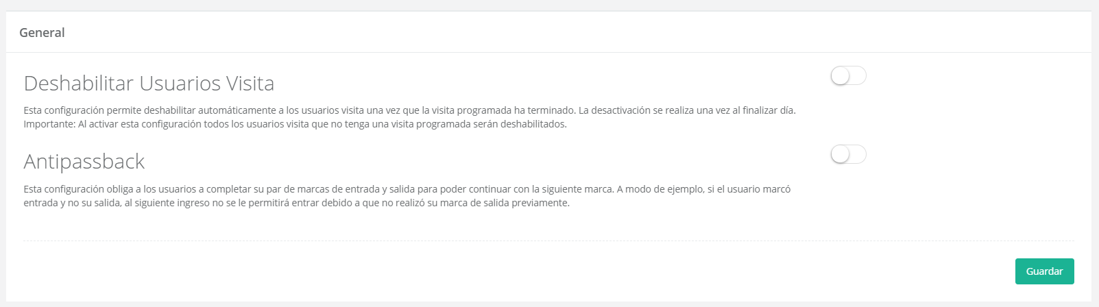 Antipassback: Esta configuración obliga a los usuarios a completar su par de marcas de entrada y salida para poder continuar con la siguiente marca. A modo de ejemplo, si el usuario marcó entrada y no su salida, al siguiente ingreso no se le permitirá entrar debido a que no realizó su marca de salida previamente.