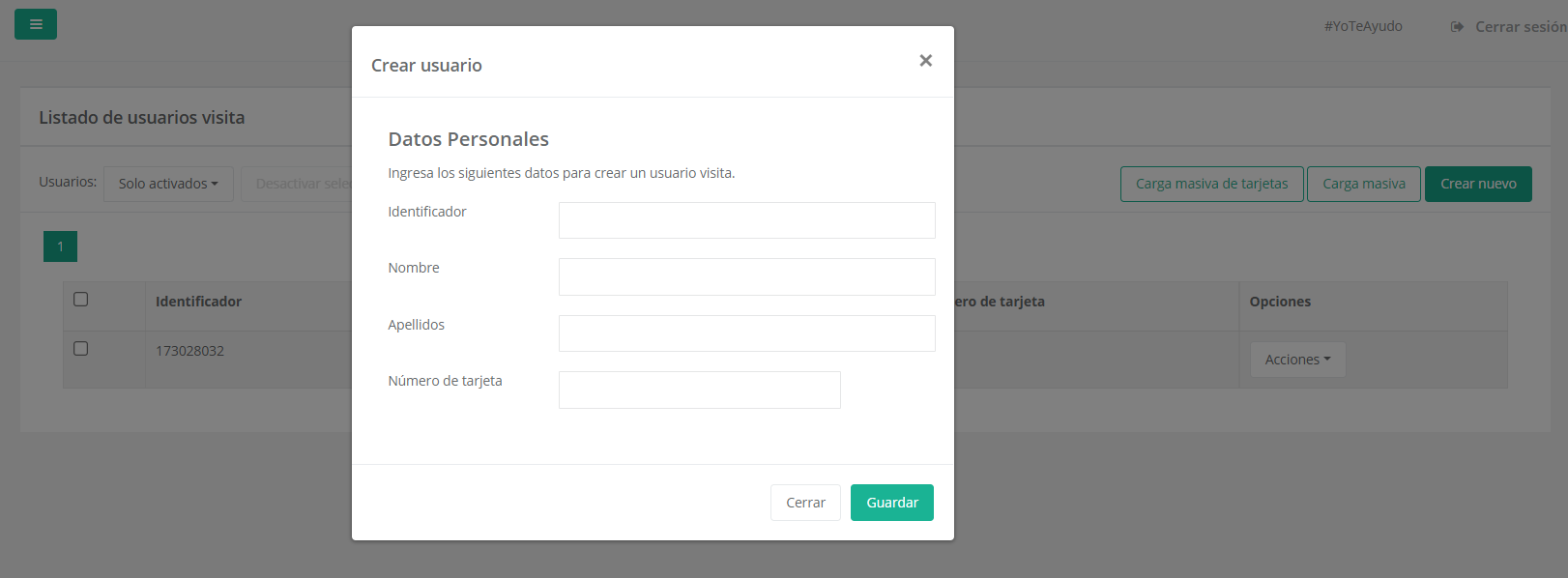 En esta pestaña, podremos crear a los usuarios visitantes, lo cual se puede realizar de dos formas, crear manualmente de a 1 persona o a través de una carga masiva. Crear nuevo: Al momento de presionar este botón, se nos abrirá la siguiente pestaña: