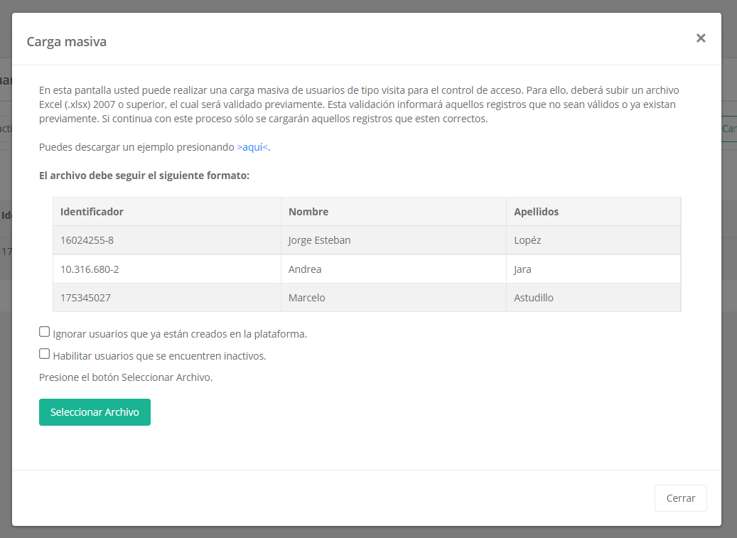 - Habilitar usuarios que se encuentren inactivos: Si en el listado que se suba hay usuarios que se encuentran inactivos, éstos serán activados nuevamente. Esta opción evita que el usuario sea creado nuevamente en la plataforma y tiene prioridad sobre la opción anterior.