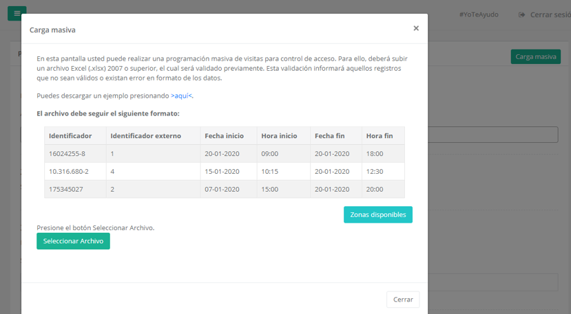 Una vez finalizado todos los campos, presionar “Crear” para crear la visita. Además, desde la propia ventana programar visitas podremos realizar una carga masiva desde un archivo de Excel, como podemos observar en la siguiente imagen: