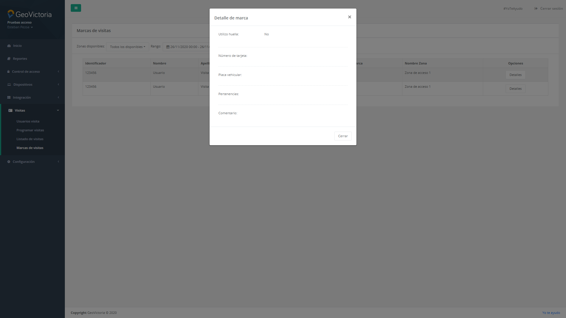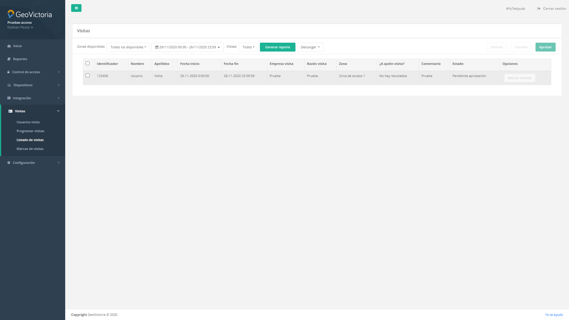 En marcas de visitas usted podrá generar un reporte filtrado por fecha, hora y zona de la marca . En este reporte podrá visualizar las marcas de las visitas y en que estado se encuentran.