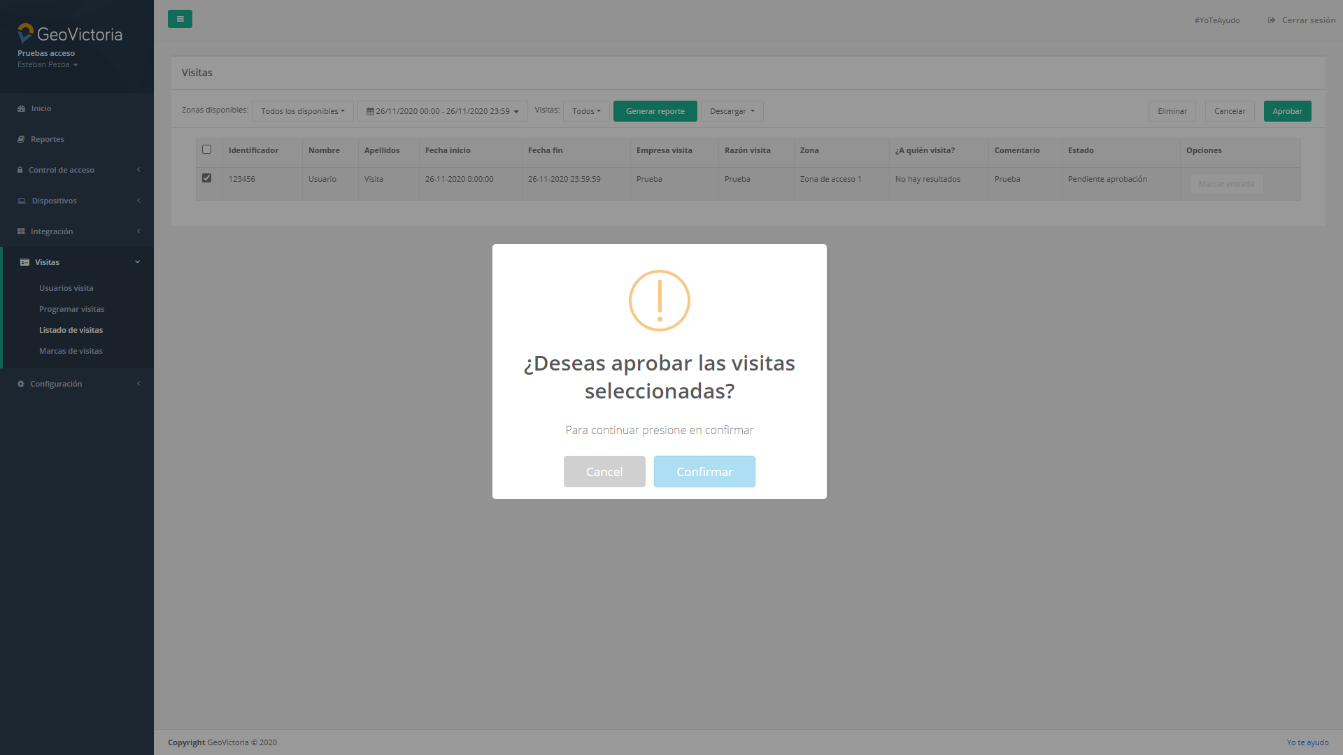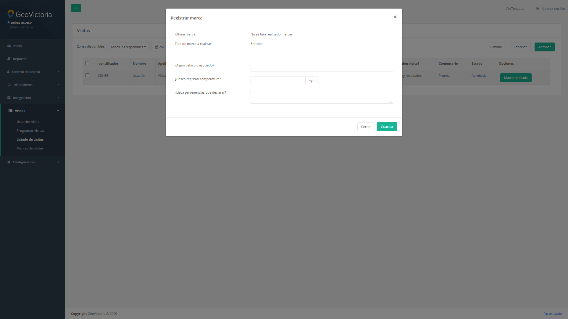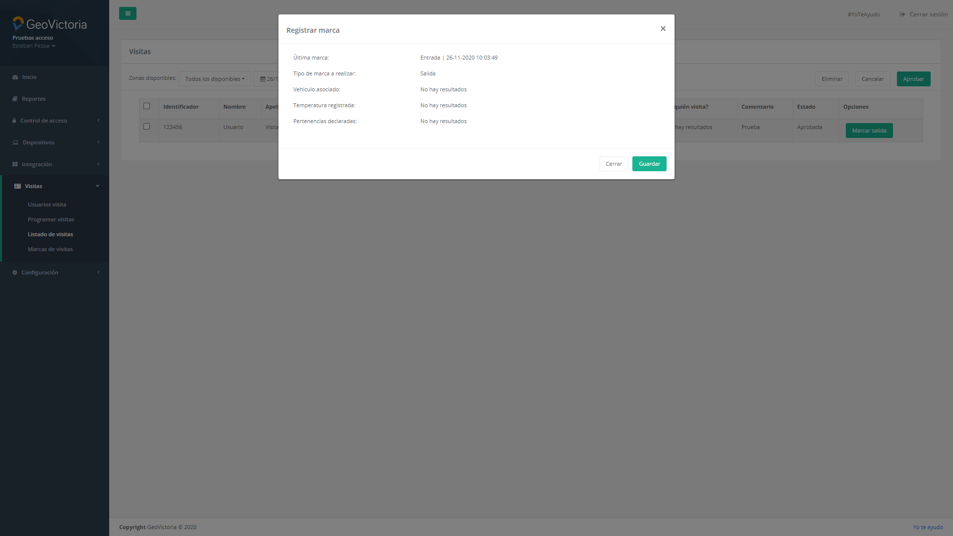 Cuando una visita se encuentra aprobada y se encuentra en el rango de tiempo en el cual está programada la visita, podrá crear marcas de entrada y salida.
