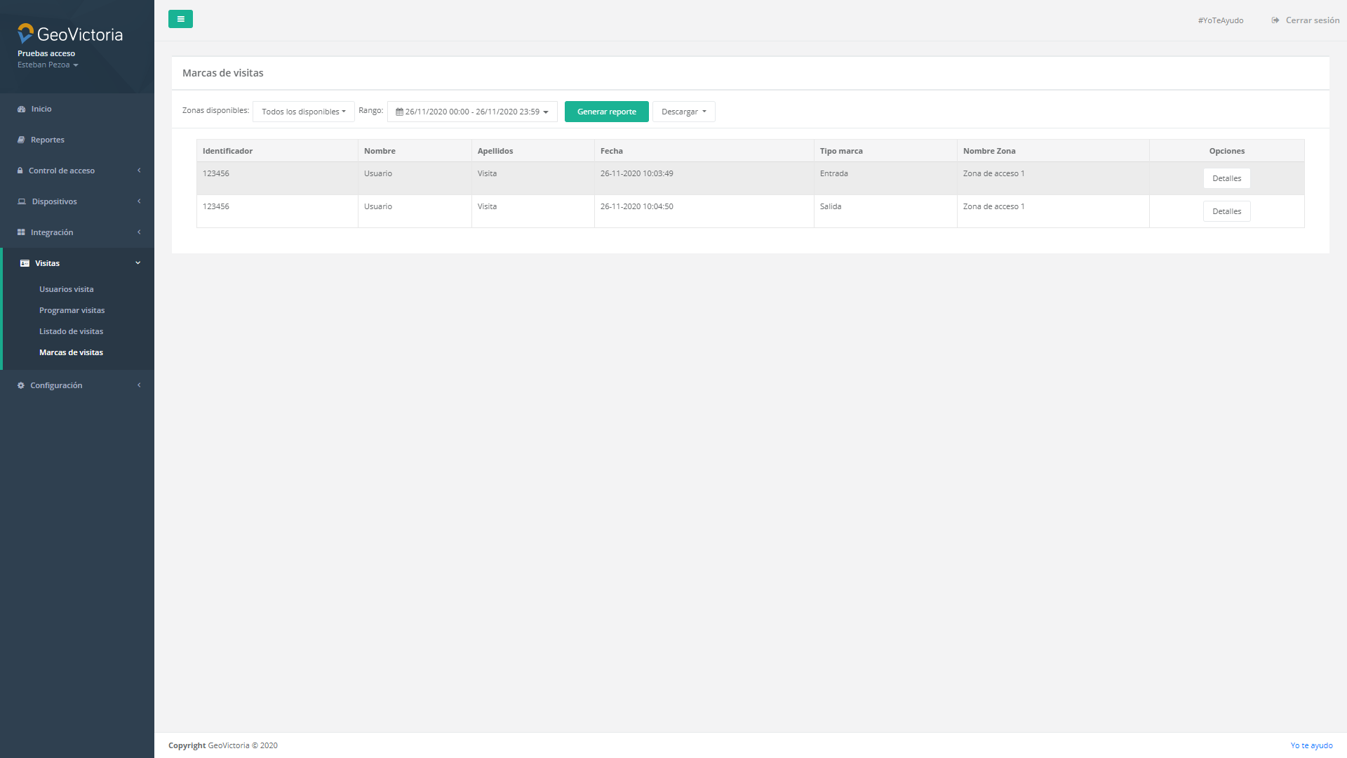 En marcas de visitas usted podrá generar un reporte filtrado por fecha, hora y zona de la marca . En este reporte podrá visualizar las marcas de las visitas y en que estado se encuentran.